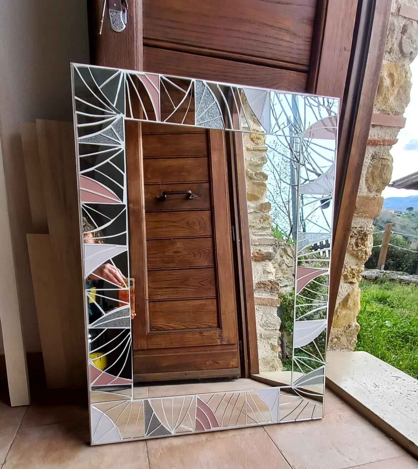 La specchiera "Annarosa" è scintillante e originale: composta da frammenti di specchio neutro, vetro rosa antico, madreperla e argento ricostruiti in splendidi ventagli di luce. Perfetta per essere montata sopra al comò, in camera da letto. Romantica e sfarzosa si sposa benissimo anche con un arredamento moderno.